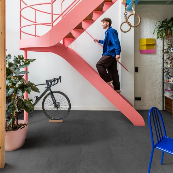 De BerryAlloc Lijmstrook Spirit Soul GD 55 Ravi 60002400 is een stijlvolle PVC tegelvloer in lijmvariant met een rustieke leisteenlook in donkergrijs. De vloer benadrukt de gelaagde structuur en karakteristieke kleurvariaties van leisteen, wat zorgt voor een natuurlijke en sfeervolle uitstraling. De tegels hebben een dikte van 2,5 mm, een breedte van 468 mm en een lengte van 933 mm. De pakinhoud bedraagt 4,18 m². De vloer is geschikt voor vloerverwarming en heeft een 4V microvelling, wat zorgt voor een rustige en harmonieuze uitstraling tussen de tegels. De gebruiksklasse is 23 en de vloer wordt geleverd met levenslange fabrieksgarantie.